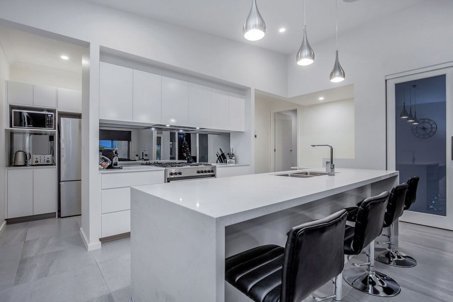 The beautifully designed kitchen is positioned perfectly as the hub of the home with a large island bench, soft close drawers, the convenience of a butlers pantry and of course furnished with high quality appliances including a large 900mm oven with gas cooktop.