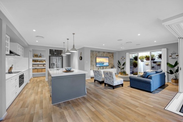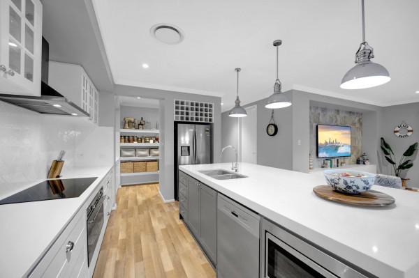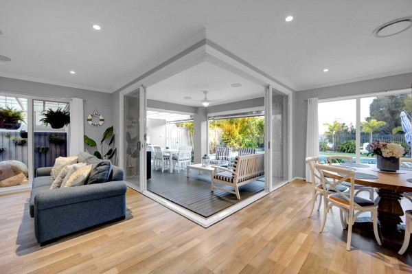 The heart of the home features an open-plan kitchen, lounge, and dining areas that lead you through to the large undercover entertainment area with a built-in BBQ and wine fridge including glimpses of the Coomera River over to Sanctuary Cove.