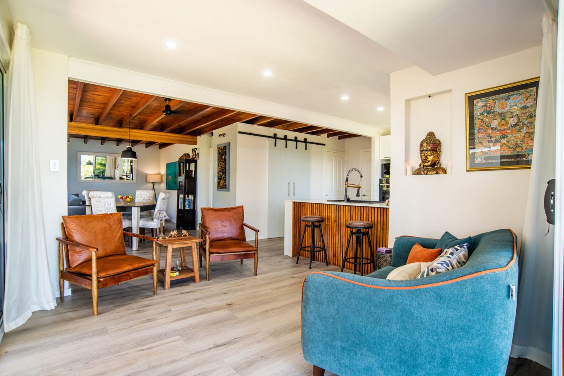 The upper level of the home is accessed from the treetop walkway that takes you to the front door and private balcony area, once inside, this home has an open plan living area with beautiful timber flooring. The use of large windows captures the amazing views across the bay.