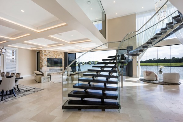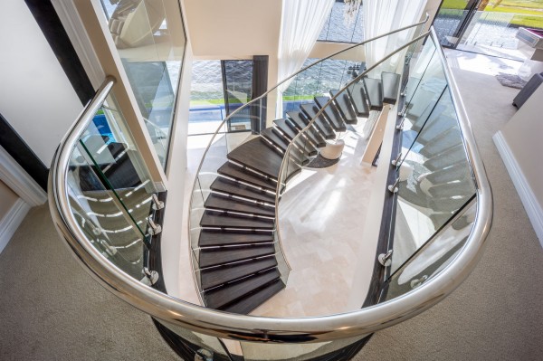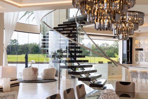 When stepping inside this North-East facing 775sqm home through the 3.9 metre high pivot entry door, you lay your eyes on the most amazing and unique custom made curved staircase with ebony treads and curved glass balustrading, positioned like artwork between the kitchen and living area.
