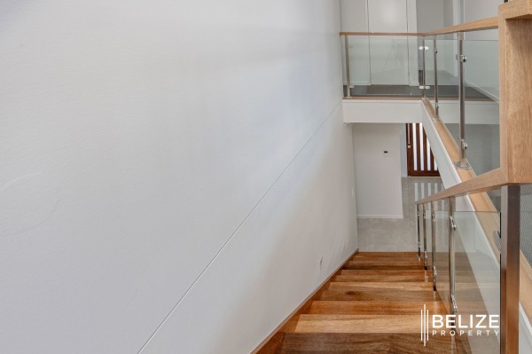- Varnished timber staircase with glass balustrade and stainless steel accents