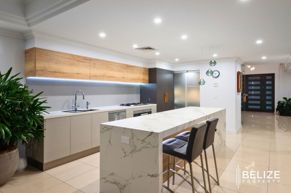 - Designer kitchen with stone waterfall island, top-end appliances, and ample storage